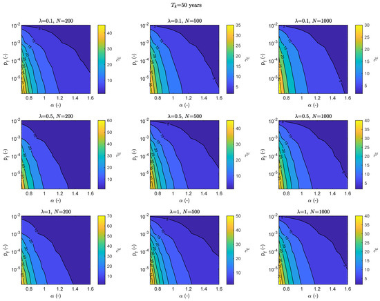 The obtained results were adopted to evaluate the correspondent values for different failure probabilities. The Authors suggest to adopt and , i.e., the 75th percentile of their distributions, while a range spanning from 0.7 to 1.6 was considered for . The calculations have been performed for annual failure probability from to .