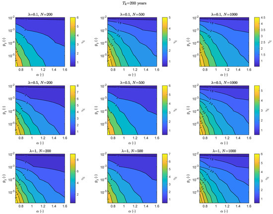 Focusing on the value, in the case of years, the plots show values of , , and, consequently of , larger if compared to those proposed by the Italian and the Austrian national standards. On the contrary, for years, equal to 0.01, the correspondent coefficient is close to one, independently from , N, and .