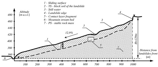 The key issue for selecting a correct method of stopping a landslide and its stabilization is the possibility of determining the parameter changes of the TS strength, which is subject to the strengthening process. In the case of these soils, a decisive factor is water content, which we can influence. It was necessary to elaborate a special methodology enabling modeling of the phenomena occurring in the crucial areas of the rock mass, which constitute the so-called “weak link” in the process of self-stabilization of a slope. Such areas are the sliding surfaces of some flysch layers, on which sliding of the neighboring layers may occur (Figure 2, item 1).