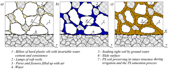 The process of flysch transformation before and after the loss of slope stability in the transformed soil (TS) structure of the contact layer: (a) TS in the dry period, (b) TS after irrigation, (c) TS after soaking (at the time of slide occurrence).