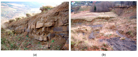 Example of the structure of a typical Carpathian flysch landslide (Stryszawa, Poland). (a) Rhythmical variables of flysch layers; (b) Opened sliding surface under the contact layer.