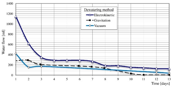 - soil dewatering using the gravitational and electrokinetic methods demonstrates constant outflows during the whole period of tests. Meanwhile, when using the vacuum method, outflows occur intensively for a short time (a few hours) and then stop. Starting the vacuum in cycles leads to renewed, intensive, short outflows.
