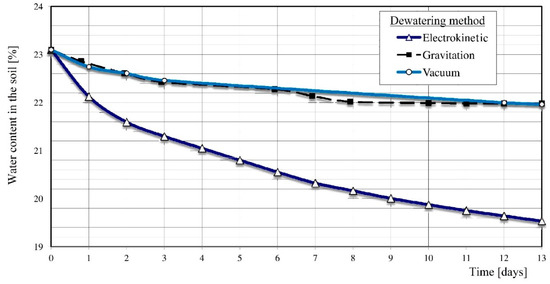 - using the gravitational method, the soil water content stabilized at a constant level. Meanwhile, with the remaining dewatering methods, especially the electrokinetic method, it decreased continually.