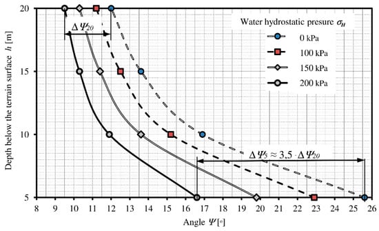 Ground water appears in the TS forming the landslide mass. The level of this water depends on atmospheric precipitation and its duration. Its presence may cause hydrostatic pressure which influences the pore pressure in the TS and changes the contact layer strength, especially on the sliding surface. Water may also exert hydrostatic pressure on the whole of the landslide block soil, regardless of its lift force. The influence of this factor was considered during studies controlling the pore pressure in the soil samples subject to shearing. Figure 10 presents the changes of Ψ (the effective angle of internal friction corresponding to the maximal border inclination of the sliding surfaces) depending on the hydrostatic pressure and depth of deposition of the slide layer.