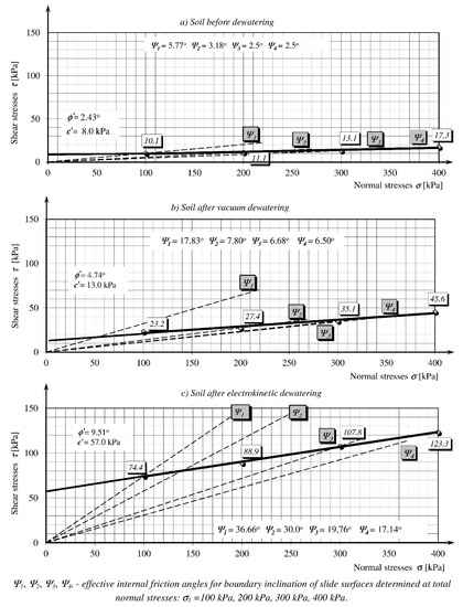 The most important issue in the studies conducted was checking the effectiveness of the methods of soil dewatering on the increase in the soil shear strength. The conditions of free outflow of water from the soil caused by gravitation were compared with two methods of acceleration of this process: application of ET and vacuum treatment. The effective angle of internal friction ϕ’ and effective cohesion c’ are two soil parameters which are the best shear strength features. In noncohesive soils, c’ = 0, and it is only possible to compare the parameter ϕ’. Meanwhile, in cohesive soils, both of these parameters have values that are different from zero and their increases differ considerably from one another. It is more convenient in this case to compare the effective angle of internal friction for the border inclination of sliding surfaces calculated according to Equations (4) and (5).