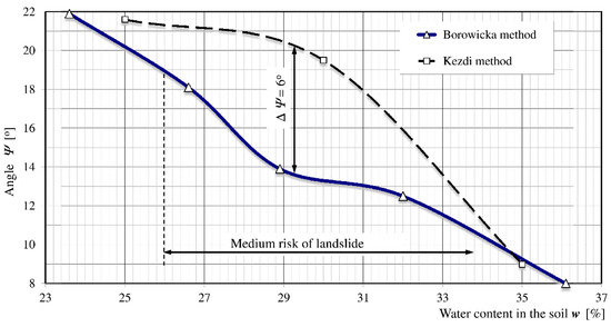 - for LI = 0.5–0.25, that is, w = 26.0–33.6%, covering the soil plasticity condition (medium risk of landslide), the largest differences between the two methods occur,