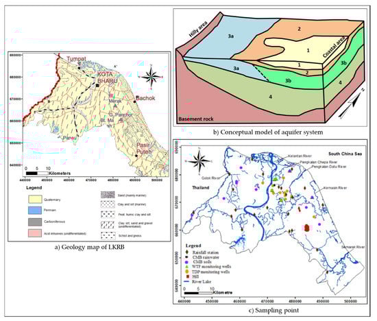 (a) Geology map of Lower Kelantan River Basin (LKRB) (modified from [47]); (b) Conceptual model of aquifer system [46]; and (c) Sampling point.