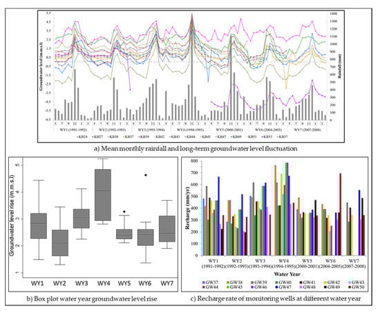 Box plots of groundwater level rise (Δh) for each water cycle (Figure 3b), after having been extrapolated using graphical approach [65] (see Section 3.2), show ranges of groundwater level rise (Δh) for WY1, WY2, WY3, WY4, WY5, WY6, and WY7 of 1.50 m to 4.44 m with a mean of 2.80 ± 0.80 m, 1.31 m to 3.45 m with a mean of 2.18 ± 0.67 m, 2.26 m to 4.12 m with a mean of 3.12 ± 0.63 m, 2.81 m to 5.24 m with a mean of 3.97 ± 0.96 m, 2.12 m to 3.27 m with a mean of 2.52 ± 0.37 m, 1.37 m to 4.63 m with a mean of 2.46 ± 0.84 m, and 1.91 to 3.69 m with a mean of 2.63 ± 0.63 m, respectively. The annual rainfall of WY1, WY2, WY3, WY4, WY5, WY6, and WY7 was 2382 mm, 2297 mm, 2895 mm, 3521 mm, 3509 mm, 2590 mm and 2426 mm, respectively, with mean of a 2803 mm. Specific yield, Sy, value reported at LKRB ranges from 0.06 to 0.3 [41,46,113]. A constant Sy value of 0.15 was used to represent the LKRB to estimate the recharge. Using Equation (3) (see Section 3.2), the estimated recharge ranges were between 225 to 666 mm/yr representing 11% to 28% of annual rainfall, 197 to 518 mm/yr representing 9% to 23% of annual rainfall, 339 to 618 mm/yr representing 12% to 21% of annual rainfall, 422 to 786 mm/yr representing 12% to 22% of annual rainfall, 319 to 490 mm/yr representing 9% to 14% of annual rainfall, 206 to 694 mm/yr representing 8% to 27% of annual rainfall, and 287 to 554 mm/yr representing 12% to 23% of annual rainfall, respectively, for W1 to WY7 as shown in Figure 3c. The average recharge estimated according to monitoring wells ranged from 321 mm/yr to 540 mm/yr with a mean recharge of 425 ± 79 mm/yr representing 11% to 19% with 15% of the long term mean annual rainfall (2790 mm), as tabulated in Table 3.