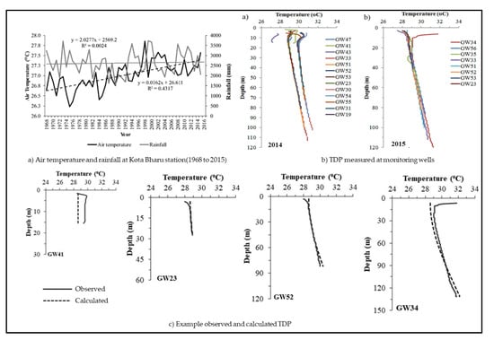 (a) Mean annual air temperature and rainfall at Kota Bharu station; (b) measured temperature–depth profiles (TDP) during sampling campaign; and (c) examples observed and calculated TDP.