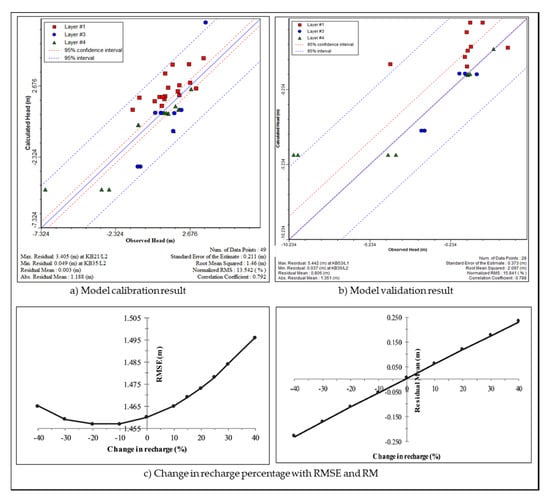 (a) Model calibration result; (b) model validation result; and (c) change in recharge percentage with RMSE and RM.