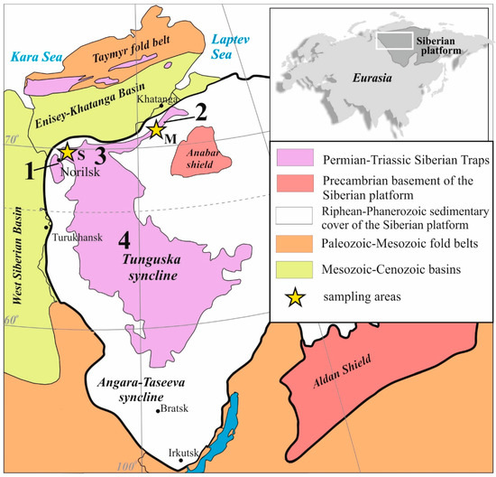 Geological scheme of the Siberian platform. Regions of the Siberian Traps LIP: 1—Norilsk; 2—Maymecha-Kotuy; 3—Putorana; 4—Nizhnyaya Tunguska. Sampling areas: S—Samoedsky Formation; M—Maymecha river valley.