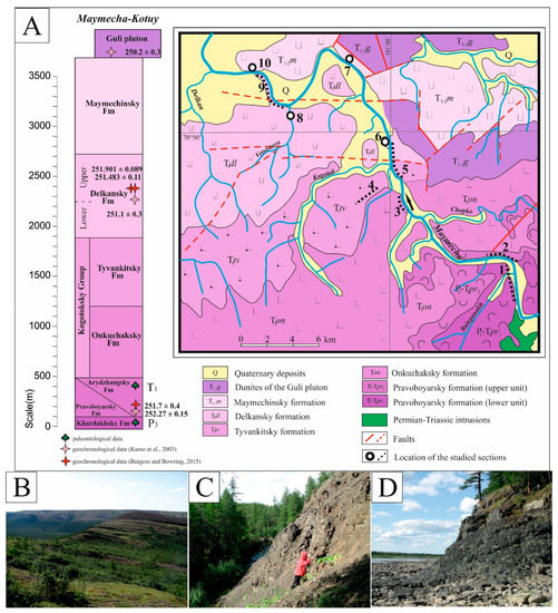 Age and stratigraphic position of the tuff-lava pile relative to the Permian–Triassic boundary (PTB) is still poorly constrained. Paleontological data indicate that, in the Maymecha river area, this boundary should be set within the Pravoboyarsky Formation, due to the presence of Upper Permian spore-pollen complexes in the lower part and Lower Triassic phyllopods, in the upper part of the unit [45]. As to the Kotuy river section, Ivanov and Pirozhnikov (1959) [46] reported Upper Permian flora in the outcrops of Potokoysky Formation which are referred to as Khardakhsky Formation in this work, and Lower Triassic phyllopods in tuffaceous lenses in the middle part of the Arydzhangsky Formation. According to this data, the PTB should be placed somewhere nearby the Khardakhsky/Arydzhangsky boundary.