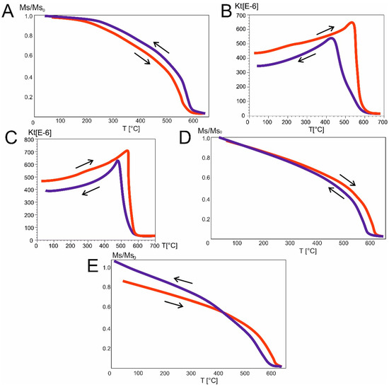 Rock magnetic properties. (A,D,E)—thermal dependences of saturation magnetization. (A)—sample 130, site on31, Onkuchaksky Formation. (D)—sample 432, site tv3, Tyvankitsky Formation. (E)—sample 733, location 8, Upper Delkansky Formation. (B,C)—thermal dependences of magnetic susceptibiblity. (B)—sample 161, site on39, Onkuchaksky Formation. (C)—sample 40, site on10, Onkuchaksky Formation.