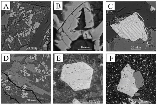 Representative SEM images of the studied samples. (A) Dendrites of titanomagnetite. Sample 140, site on34, Onkuchaksky Formation. (B) Titanomagnetite with fracturing typical for low-temperature maghemitization. Sample 164, site on39, Onkuchaksky Formation. (C) Titanomagnetite with structures of deuteric oxidation. Sample 349, site tv21, Tyvankitsky Formation. (D) Large dendrites of titanomagnetite. Sample 524, site s5, Tyvankitsky Formation. (E) Large titanomagnetite grain with structures of low-temperature oxidation. Sample 228, location 5, Lower Delkansky Formation. (F) Titanomagnetite grain with complex decay structures. Sample 743, location 9, Upper Delkansky Formation.