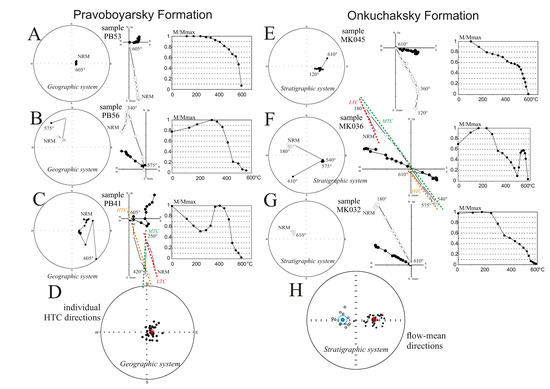 Results of the thermal demagnetization of the Pravoboyarsky and Onkuchaksky formations. (A–C) Representative stereoplots, Zijderveld plots and demagnetization paths for the Pravoboyarsky Formation. (A)—sample PB53, site pb12. (B)—sample PB56, site pb13. (C)—sample PB41, site pb10. (D)—paleomagnetic directions of individual samples for the Pravoboyarsky (geographic coordinate system). (E–G) Representative stereoplots, Zijderveld plots and demagnetization paths for the Onkuchaksky Formation. (E)—sample 45, site on11. (F)—sample 36, site on9. (G)—sample 32, site on8. (H)—site-mean paleomagnetic directions for the Onkuchaksky Formation (stratigraphic coordinate system). Closed (open) circles indicate lower (upper) hemisphere.