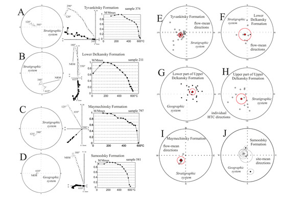 Results of the thermal demagnetization of the Tyvankitsky, Delkansky, Maymechinsky, and Samoedsky formations. (A–D) Representative stereoplots, Zijderveld plots and demagnetization paths. (A)—sample 374, site tv18, Tyvankitsky formation. (B)—sample 211, location 5, Lower Delkansky Formation. (C)—sample 797, site mm5, Maymechinsky Formation. (D)—sample 581, site sm4, Samoedsky Formation. E-J. Distribution of paleomagnetic directions. (E)—Tyvankitsky Formation, site-mean directions, stratigraphic coordinate system. (F)—Lower Delkansky Formation, site-mean directions, stratigraphic coordinate system. (G)—lower part of the Upper Delkansky Formation, geographic coordinate system. (H)—upper part of the Upper Delkansky Formation, geographic coordinate system. (I)—Maymechinsky Formation, site-mean directions, stratigraphic coordinate system. (J)—Samoedsky Formation, site-mean directions geographic coordinate system. Closed (open) circles indicate lower (upper) hemisphere.