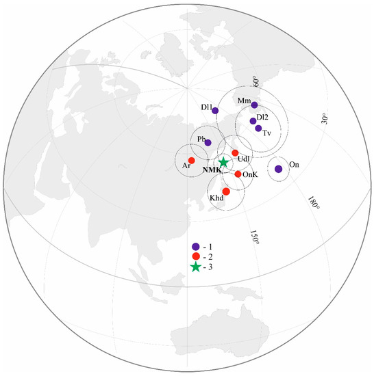 Position of mean virtual geomagnetic poles for the studied formations (stratigraphic coordinate system). (1)—this study: Pb—Pravoboyarsky; On—Onkuchaksky; Tv—Tyvankitsky; Dl1—Lower Delkansky; Dl2—Upper Delkansky; Mm—Maymechinsky Formation. Confidence circles for Dl1 and Mm poles are not shown. (2)—previously published poles: Ar—Arydzhangsky Formation [33]; On—Onkuchaksky Formation in the Kotuy river valley [33]; Udl—Ust-Delkan dike complex [65]. (3)—paleomagnetic pole NMK [41].