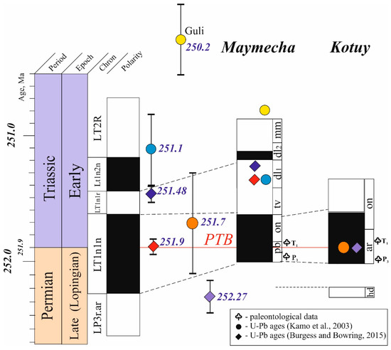 If we take as a basis U-Pb ages from [15], then the age of Arydzhangsky Formation is 251.7 ± 0.4 Ma, being slightly younger than PTB after [47], but overlapping this boundary within the confidence intervals. This interpretation is completely consistent with the paleomagnetic and paleontological data. Then, the interval of normal polarity recorded in the Arydzhangsky and Pravoboyarsky formation, corresponds to subchron LT1n1n (following the nomenclature of [66,67]), which contains the Permian–Triassic boundary in its lower part. Furthermore, the Tyvankitsky and Lower Delkansky formations in Maymecha district, as well as the upper part of Onkuchaksky Formation in Kotuy area, correspond to subchron LT1n1r. Lower Delkansky Formation is dated by Kamo et al. (2003) [15] at 251.1 ± 0.3 Ma, that is a little younger than the end of this subchron attributed at 251.444 Ma [67]; however, considering the confidence interval, this dating almost coincides with the chron boundary. We emphasize that in this case only the Khardakhsky Formation is definitely older than the Permian–Triassic boundary and the onset of extinction (Figure 8).