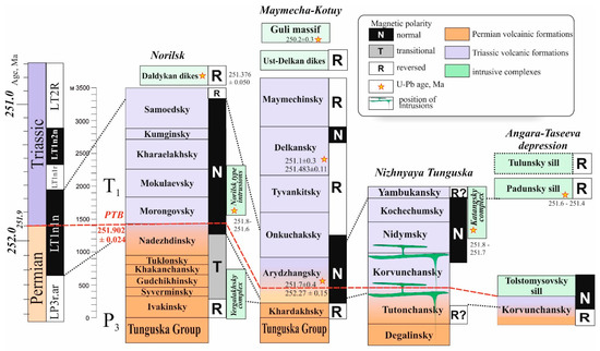 As seen in Figure 9, the main stage of magmatic activity during the Siberian Traps emplacement corresponds to the chron LT1n1n above the PTB. This can be important considering the idea of two stages of the Permian–Triassic biotic crisis [89,90,91]. The second pulse of mass extinction is attributed to the conodont zone Isarcicella staeschei, corresponding to Bed 28 in GSSP section of Meishan [90,92]. This bed is located within the same interval of normal magnetic polarity LT1n1n [78] and is dated at 251.880 ± 0.031 Ma by [47]. Thus, the main stage of volcanic activity in the Siberian platform can overlap the younger pulse of extinction.