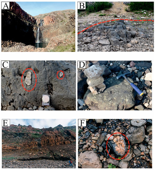 (A) Lava flows in the bottom of Ivakinsky Formation near the town of Talnakh. Thickness of the lowermost flow is about 50 m. (B) An outcrop of the alkaline-ultramafic breccia pipe in the Kotuy river valley. (C) Large clasts of syenites and ultramafic rocks in the volcanic breccia, the Kotuy river. (D) Boulder of olivine-rich breccia with lithic clasts of meimechites, the Kotuy river. (E) Sill of the Yergalakhsky complex intruding coal-bearing sediments of the Tunguska Group, the Norilsk region. (F) Intrusive contact of Yergalakhsky trachydolerites and coals of the Tunguska Group (in a boulder).