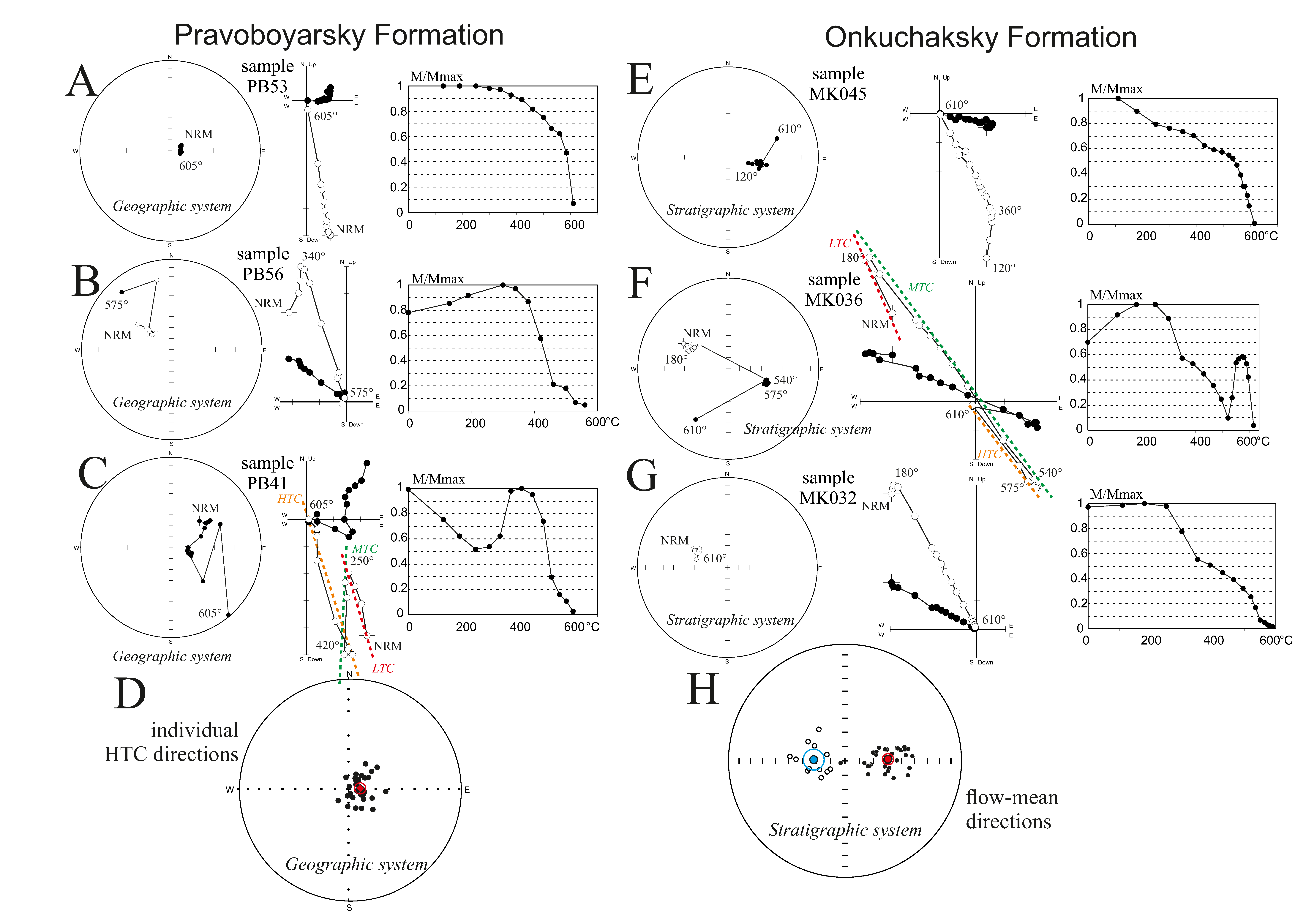 - Positive “baked contact test”: Pravoboyarsky tuffs in the contact zone of the picritic dike are partially remagnetized, but the primary component of normal polarity is still preserved.