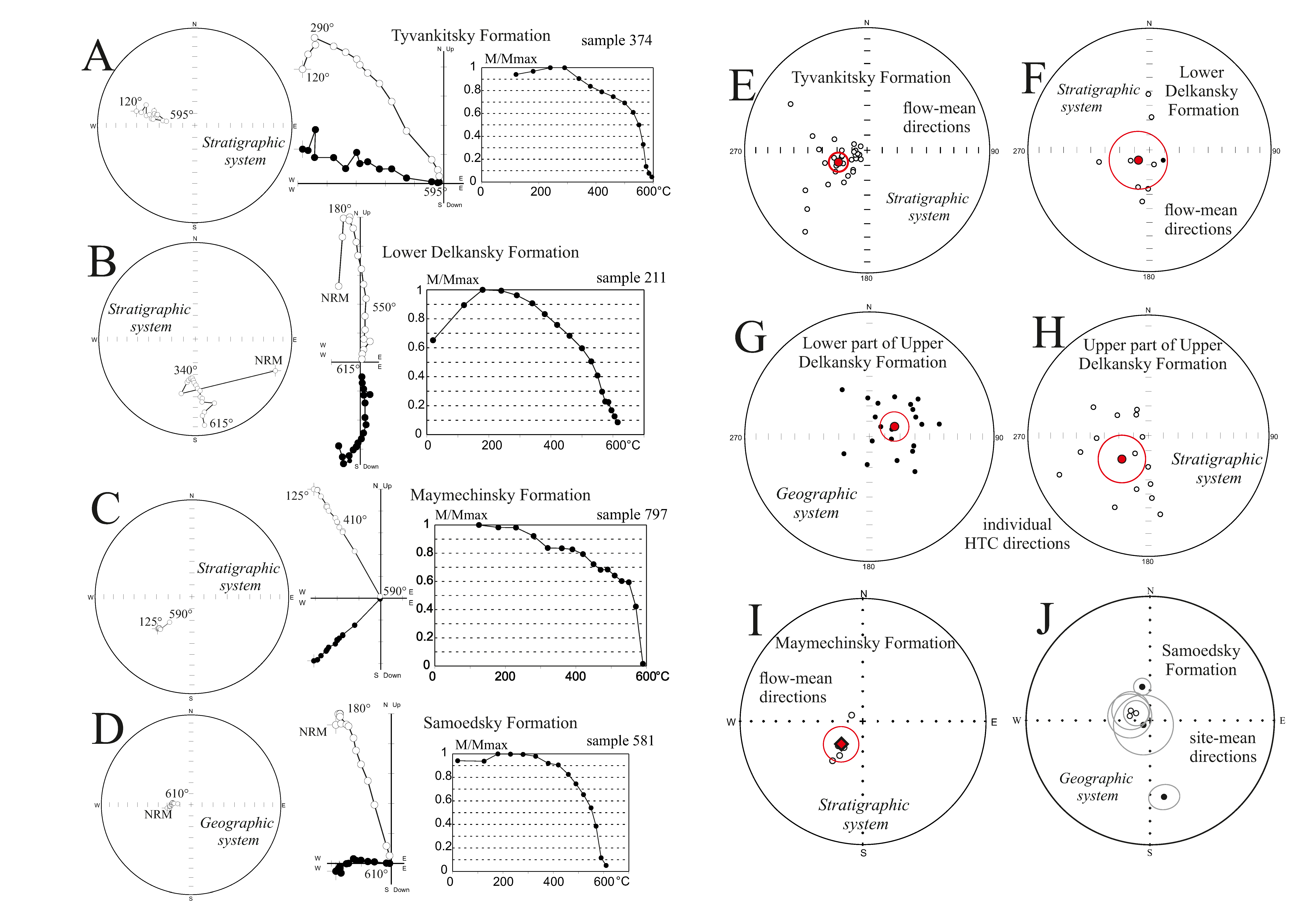 - Reliable determinations of the paleointensity for the Tyvankitsky and Delkansky formations [55], pointing to the thermoremanent origin of NRM.