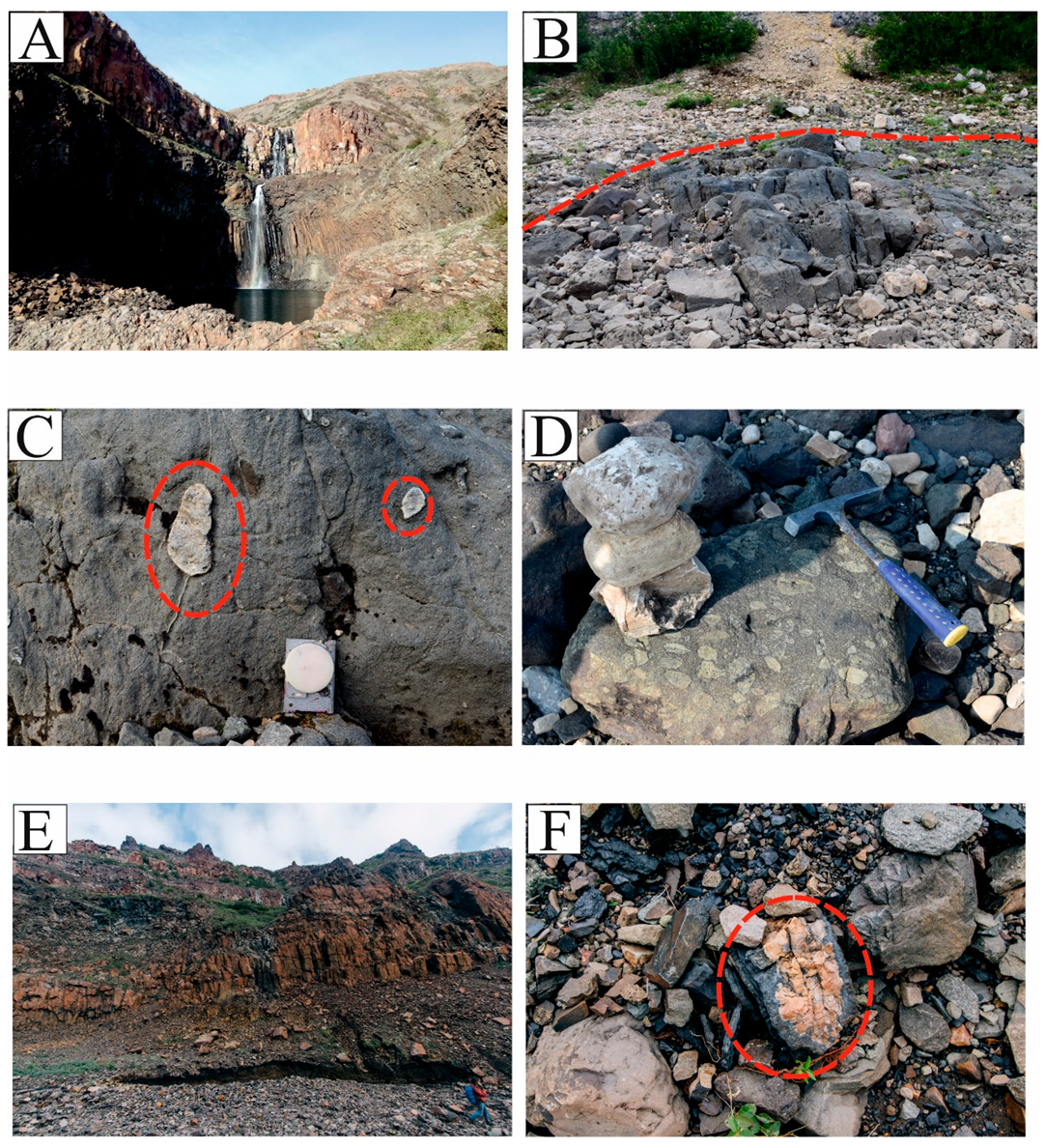 - Shihorina, K.M. Volcanic formations of the Maimecha-Kotuy province. In SB. Carbonatites and Alkaline Rocks of the North of Siberia (Collection of Articles); Leningrad State University: Leningrad, Russia, 1970; pp. 5–14. (In Russian) [Google Scholar]