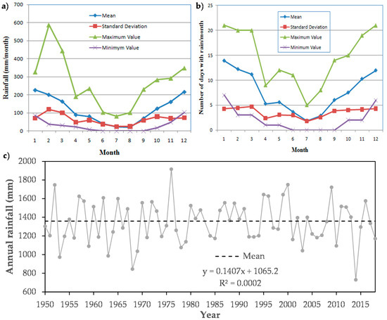 Mean rainfall/month (a) and number of days with rain/month (b) for the last 20 years and (c) annual rainfall from a 68-year series (1950–2018) in the study region.