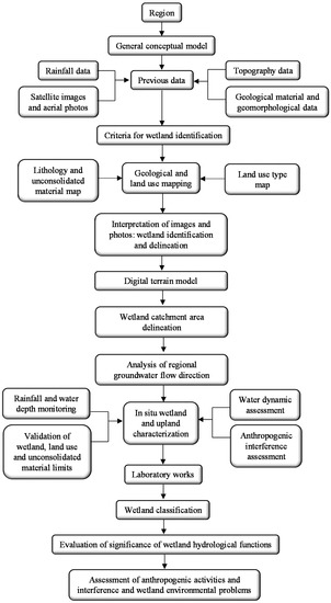 To evaluate degradation and characterize depressional wetlands in the study area, we applied a landscape-level assessment [30], which considered the use of geographic information systems, remote sensing, and previous data. Based on this assessment level, we determined the distribution of geological materials, delineated wetlands and catchment areas, analyzed the temporal variations and distributions of ponded water and land use types, identified anthropogenic interferences (e.g., road density and presence of drainage ditches), and established the significance of wetland functions, which permitted us to inventory, describe, and provide an overview of wetland conditions. We also considered some field procedures to validate information obtained through the landscape assessment and to improve our comprehension of wetland characteristics, water dynamics, and degradation levels. The field procedures included monitoring rainfall and water levels in some wetlands, validating land use and geological material maps and anthropogenic interferences, improving wetland limits, and performing soil sampling. Based on these factors, the method scheme is illustrated in Figure 3. Some of the proposed steps adopted previously established methods such as the classification of wetlands or were modified, for example, the determination of the function significance step. However, monitoring of the water depth, evaluation of anthropogenic interference, and wetland degradation steps were proposed.
