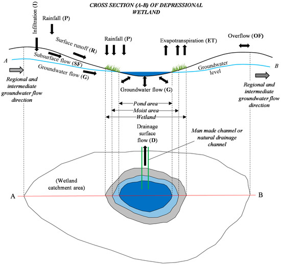 The depressional wetlands in Leme were also verified to show variability in terms of wetland water dynamics. The depressional wetlands were classified into two subclasses, the functional scheme of which is shown in Figure 9a,b. The characteristics of the hydrogeomorphological subclasses recognized in the study area are described below.
