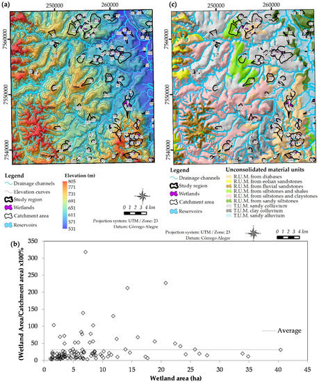 Spatial distribution of wetlands: (a) wetland distribution associated with the drainage channel network, elevation curves, digital terrain model, and the corresponding catchment area; (b) data regarding the ratio between the extents of a wetland and its catchment area; (c) map of unconsolidated materials and wetlands associated with the contribution zones. Legend: R.U.M.: residual unconsolidated material; T.U.M.: transported unconsolidated material.