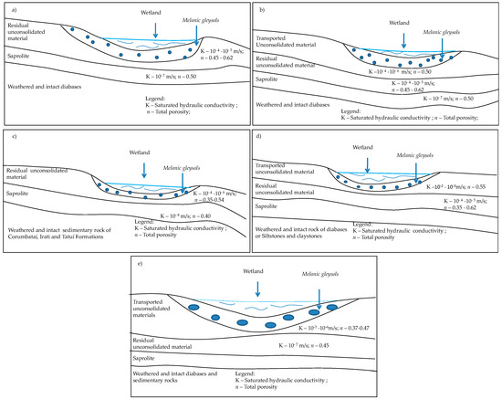 Wetlands and geological materials: (a) typical cross section of wetlands associated with diabase and residual unconsolidated material; (b) typical cross section of wetlands associated with transported unconsolidated material composed of clay colluvium overlying the diabase; (c) typical cross section of wetlands associated with residual unconsolidated materials from the Corumbataí, Irati, and Tatuí Formations; (d) typical cross section of wetlands associated with transported unconsolidated material consisting of sandy colluvium deposited on the residual materials; (e) typical cross section wetlands associated with unconsolidated materials in alluvial deposits.
