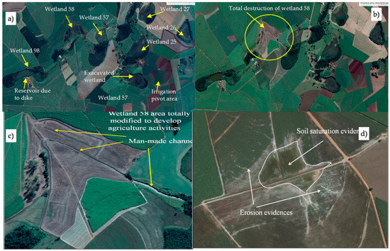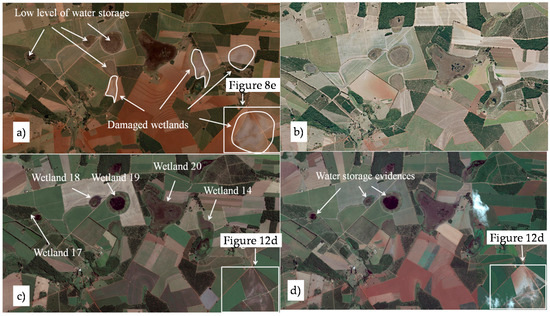 In relation to wetland hydrological conditions, the ponded water and saturated soil conditions identified in the field and in satellite images were different for the dry and wet seasons. During the dry period, most of the wetlands were dry; however, some still had some water in the center of the wetland, or the soil was saturated. For wet periods, some of the wetlands presented ponded water varying from 0.01 to 1.5 m in depth, and in the others, the soil was saturated. Figure 7 shows the conditions of a set of wetlands for four different periods, which highlights the water condition variations during the dry and rainy periods and for specific years. Dry wetlands with little water are shown in Figure 7a,b (2004 and 2011, respectively), which are consistent with the dry periods. Figure 7c,d (2016 and 2017, respectively) show features that indicate the presence of water, which is the result of the rainy period. Another interesting hydrological aspect observed in the study area was the occurrence of throughflow in some wetland catchment areas associated with sandy colluvium unconsolidated material, which covered residual unconsolidated material from diabases.