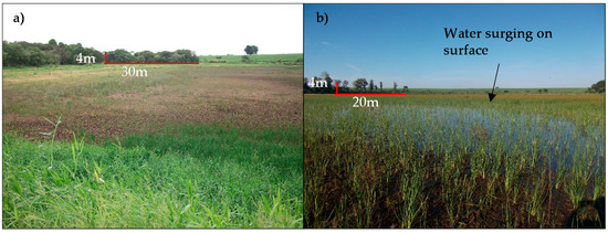For water level monitoring, we considered different hydrological conditions, which represented the conditions of the water level before and after the rainy season. Table 4 shows the results of the hydrological conditions observed in the monitored wetlands. Before the rains, these wetlands were mostly dry (54%), the soil was slightly saturated (6%), the ponded water depth was low (26%) or the groundwater level was near the surface in artificial drainage channels, and some wetlands suffered excavation and augering holes (14%). Different hydrological conditions were observed after the rainfall events that occurred in the study area. Figure 8a,b show the differences in one of the monitored wetlands before and after the rainy season. Five wetlands that were dry, two with saturated soil conditions, and one with water in artificial drainage channels and excavation holes showed evidence of flooding (23%). All the wetlands that presented ponded water had increased water volumes (26%). The wetlands that showed water in ditches and excavation holes also had elevated water levels (11%). However, eight dry wetlands (23%) showed no evidence of ponded water, saturation, or water in ditches and wetlands that had been excavated for water supply after a rainy season.