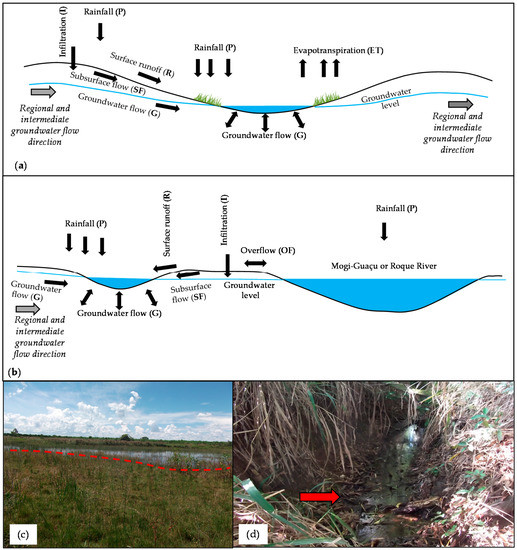 (a) Functional scheme of wetlands located in topographical depressions in high and plain positions of the terrain; (b) functional scheme of wetlands on topographical depressions in lowlands near or in the floodplains of the Mogi-Guaçú and Roque Rivers; (c) example of diffuse spring; (d) example of point spring.