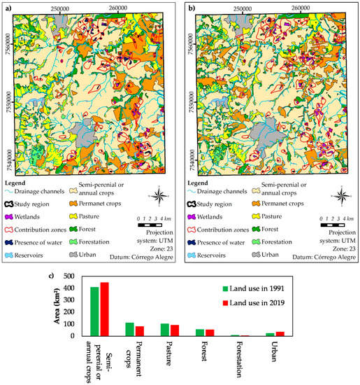 For the years 1991 and 2019, we developed land use and occupation maps, and the land use conditions in 2019 were validated in the field. The satellite images (Landsat) used to elaborate the land use and occupation maps were from the same period of the year (the rainy season) to represent the same season, and both years also presented similar rainfall event characteristics. In the ArcGIS 9.3 software, the satellite images were georeferenced, and land use boundaries were delineated manually.