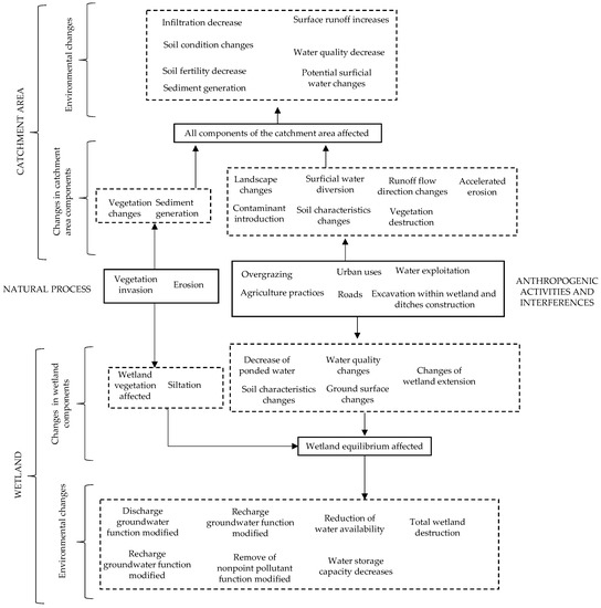 To comprehend the global situation of degradation in the study area based on an understanding of the dynamic wetland water components, Figure 13 shows the main anthropogenic activities that were identified in the region, the modifications of the components of the wetland and catchment areas, and the main environmental changes that could occur in both the wetlands and the catchment areas. The relationships shown in Figure 13 demonstrate that anthropogenic interferences affect the factors that modify the equilibrium of wetlands and catchment areas and can lead to changes in the wetland water dynamics and even the destruction of the wetlands. Agricultural activities are the most influential because they change the environmental conditions of both the wetlands and the catchment areas, which leads to the degradation of the wetlands.