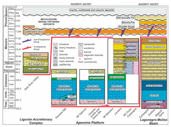 - Vitale, S.; Ciarcia, S. Tectono-stratigraphic and kinematic evolution of the southern Apennines/Calabria-Peloritani Terrane system (Italy). Tectonophysics 2013, 583, 164–182. [Google Scholar] [CrossRef]