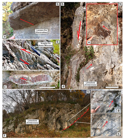 Laviano: (a) thrust fault in calcarenites of the Laviano Fm.; (b) S-C structures associated to a north-verging thrust within the gray Scaglia Fm; (c) pre-buckle thrust in red chert within the Scaglia Rossa Fm; (d,e): normal fault plane crosscut by north-verging thrust faults. Bagnoli Irpino: (f) back-thrust within the Cretaceous succession; (g,h) striations and steps.
