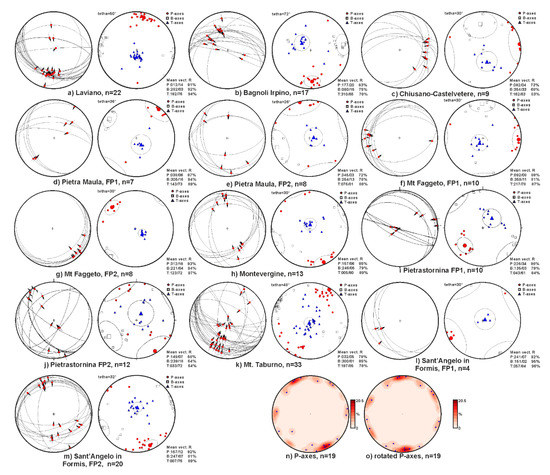 Stereographic projections of (a–m) faults and corresponding PBT plots; (n) T-axes; (o) T-axes rotated 20° counterclockwise.