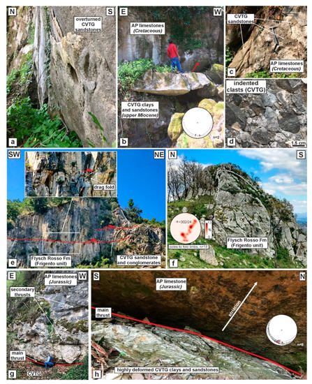 Pietrastornina: (a) overturned CVTG beds; (b) main thrust fault of Apennine Plattform (AP) Cretaceous limestones onto shales and sandstones of CVTG; (c) CVTG sandstone covering AP Cretaceous limestones; (d) indented calcareous clasts in CVTG; (e) vertical beds of Flysch Rosso Fm crosscut by a sub-horizontal thrust verging to NE with associated drag folds in the footwall. Mt Taburno: (f) overturned fold in Flysch Rosso Fm verging to the north; (g,h) the main thrust between AP Jurassic carbonates onto highly deformed clays of CVTG.