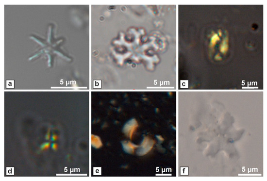 Microphotographs of the calcareous nannofossil species: (a) Discoaster brouweri, parallel nicols (sample CVTG 13); (b) Discoaster variabilis, parallel nicols (sample CVTG 13); (c) Helicosphaera wallichii, cross nicols (sample CVTG 9); (d) Sphenolithus abies, cross nicols (sample CVTG 3); (e) Rericulofenestra pseudoumbilicus, cross nicols (sample CVTG 4); (f) Discoaster loeblichii, parallel nicols (sample CVTG 18).