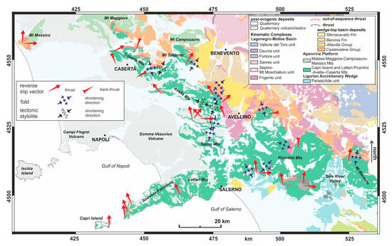 - Pappone, G.; Ferranti, L. Thrust tectonics in the Picentini Mountains, Southern Apennines, Italy. Tectonophysics 1995, 252, 331–348. [Google Scholar] [CrossRef]