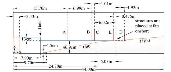 Current speeds were also measured and considered when deciding the initial conditions. The selected initial conditions or the water column of 0.13 m at the reservoir end, generated a maximum current speed on the shore of about 6.25 m/s (~0.7 m/s in model scale) when reaching the shore. Historical records of the 2004 Indian Ocean tsunami and the 2011 Great East Japan Tsunami were taken into consideration when deciding the initial conditions for the experimental setup. The observed water level data during the 2011 Great East Japan Tsunami can be downloaded from the official website of Nationwide Ocean Wave Information Network for Ports and Harbors (NOWPHAS) []. In the case of the 2004 Indian Ocean tsunami, the observed tide gauge data can be found in the publication of Grilli et al. []. These were both considered for this study, however, these data recordings have significant deviation due to dependences on the location, measuring depth and the event itself, it was decided to follow a 7 m (~8.75 cm in model scale) tsunami wave height near the shoreline. This provided a realistic representation of an average tsunami wave height in the modelling environment.