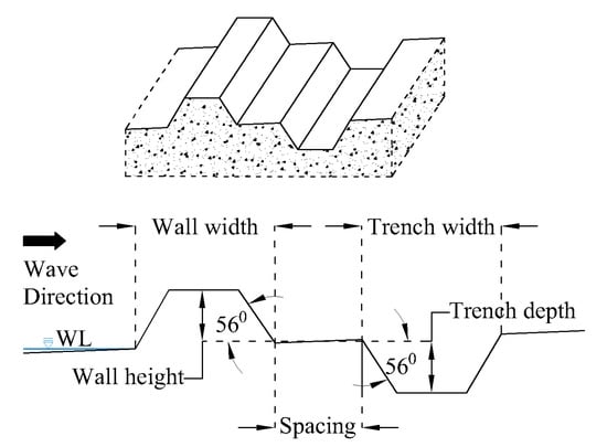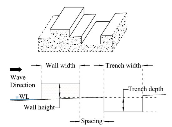- Silva, A.; Araki, S. Submerged wall-trench systems to suppress tsunami impact on coast. Proc. Int. Offshore Polar Eng. Conf. 2019, 3, 3253–3260. [Google Scholar]