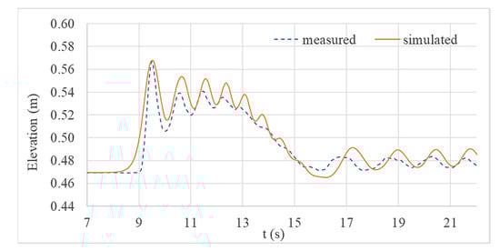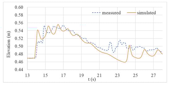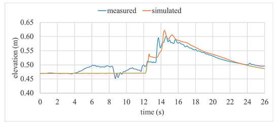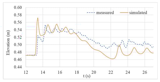 Although the numerical model was calibrated for an extent by water level and current velocity data, validation is necessary to justify the numerical results that are discussed under Section 4. However, we were unable to capture enough experimental data around the structure system due to some limitations of measuring instrumentation. Specially, current velocity variations at the structure system were could not be measured by our instrumentation as the structure was located above the still water level at the initial stage. Nevertheless, water level variations just in front of the wall and trench structure system (Location E in Figure 1) were measured for the simulation Case 03 (Table 2). The comparison of measured water level variations and simulation data are shown in Figure 28.