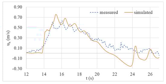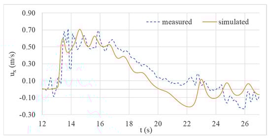 Figure 7 and Figure 8 show the comparison of measured and simulated current velocity variations at gauge locations B and C. As a result of limited resources and some practical difficulties, the authors measured current velocity variations only at gauge locations B and C. By examining both figures, it is clear that the shape of the current velocity variations were also reproduced comparatively well by the numerical model. Even though there is a deviation at the end of the wave bore, the maximum current velocities were accurately predicted by numerical simulations.