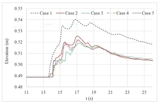 This section discusses the results of simulation cases of differing structures. The water level variations and current velocity variations at each gauge location are given in the following figures. Figure 9 and Figure 10 represents the variations of parameters at location D (lee side of the structure) for Cases 1 to 5; previously described in detail in Section 3.2.