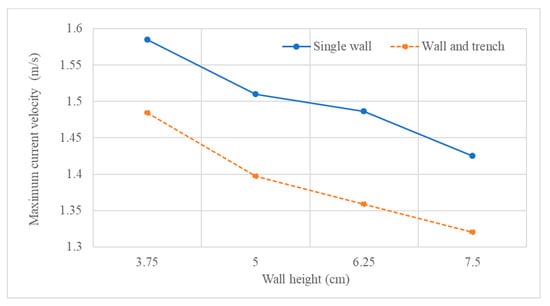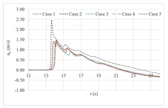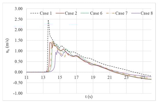 Similar to other comparisons previously presented, Figure 15 shows a reduction of the maximum water level variation after applying structures onshore. The wall and trench system with the deepest trench had suppressed the upcoming wave better than any other structure combinations. All the other wall and trench systems had also damped the free surface variation better than a single seawall system. The current velocity variations (shown in Figure 16) of the simulation cases with wall and trench systems also had damped values compared to that of the simulation case with a single seawall. Additionally, the arrival times of the wave had increased for all the simulation cases with a wall and trench system compared to that of the simulation with a single seawall. The simulation case with the deepest trench presented the most effective wave damping.