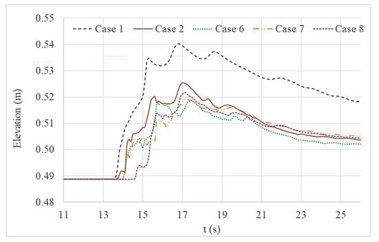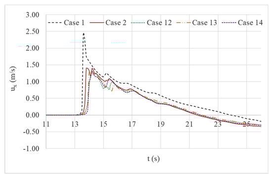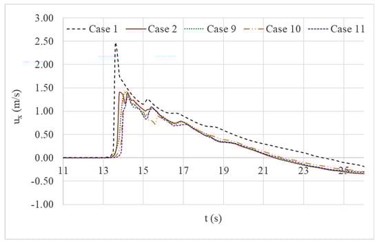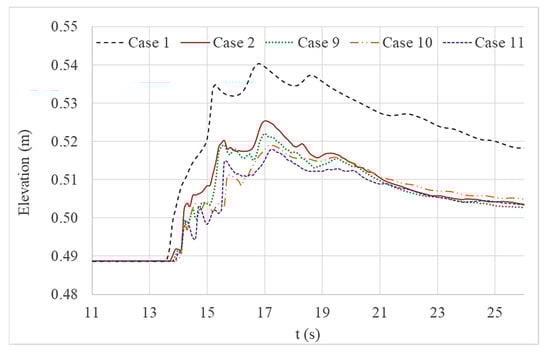 Figure 13 and Figure 14 both give a comparison of the water level variations and the current velocity variations respectively at location D for Cases 1, 2, 9, 10 and 11 respectively. The width of the wall was increased gradually in Cases 9, 10 and 11 to assess the impact while maintaining the same geometric parameters of the structural system.